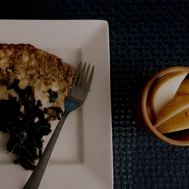 http://justenoughwellfed.tumblr.comToday's Breakfast: Cauliflower pizza & a pear 😎