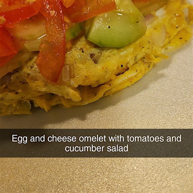Good morning, enjoying my breakfast. Can we get a breakfast thread going? Here's mine Egg and cheese omelet with tomato and cucumber salad